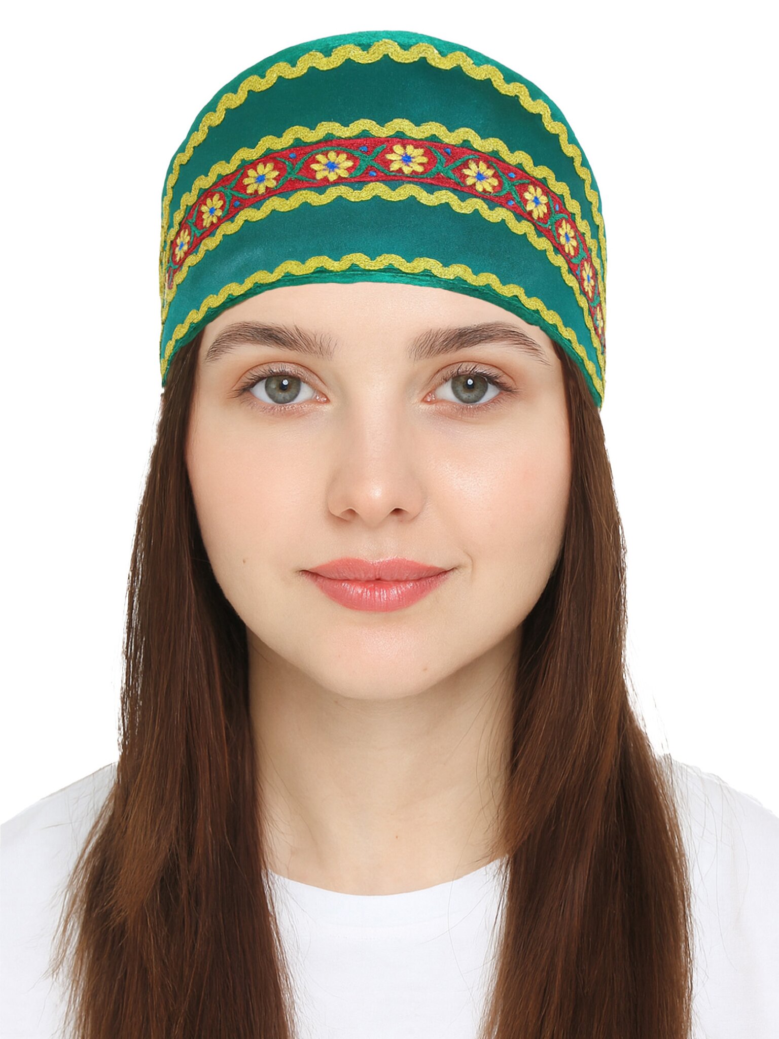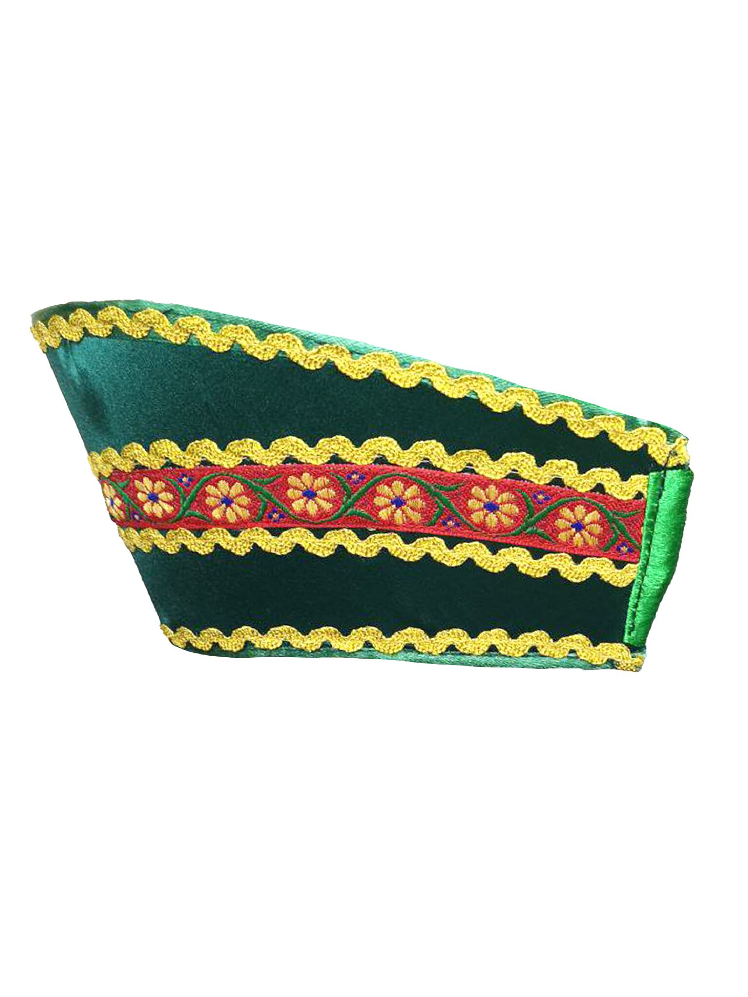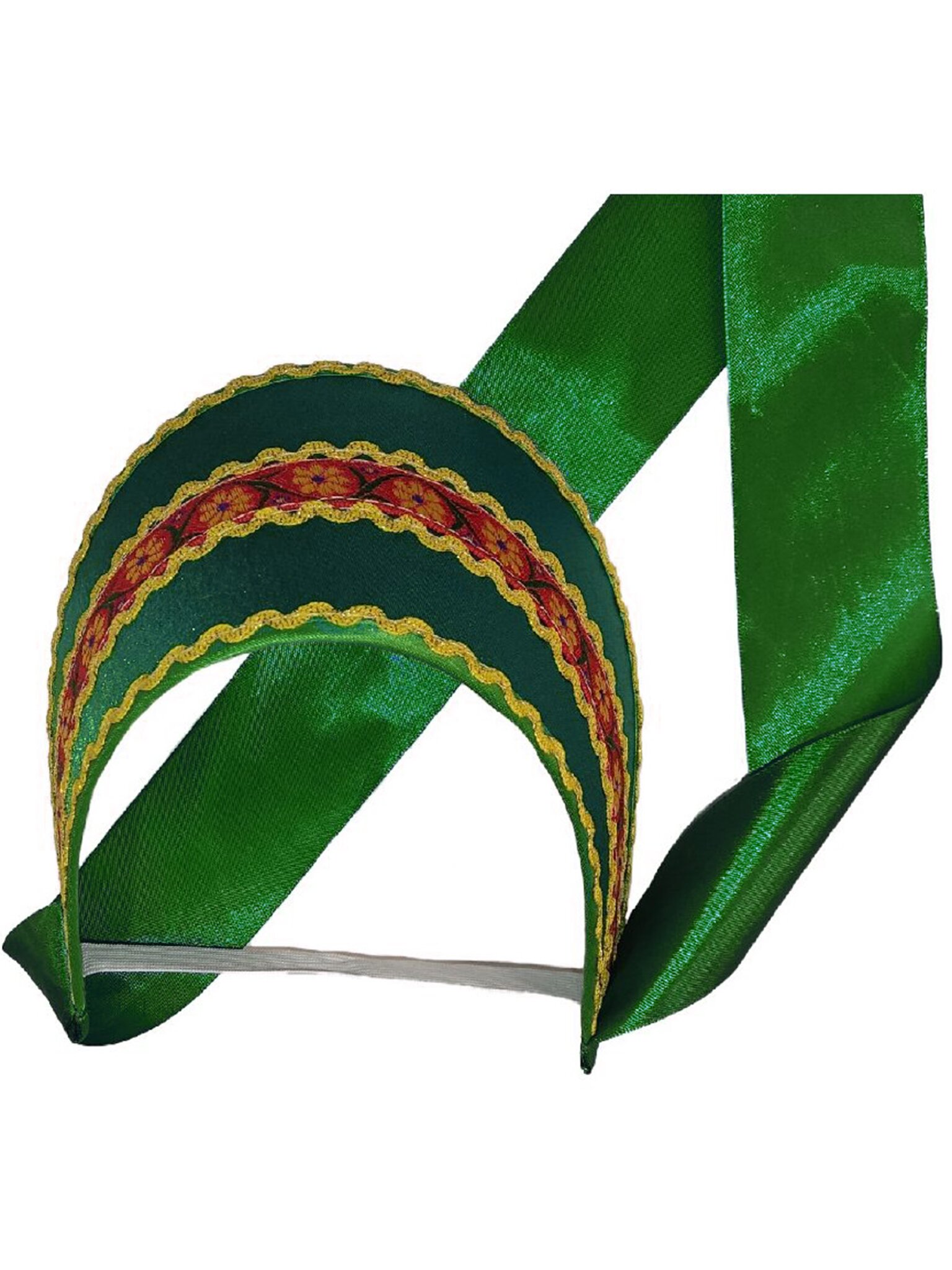 Кокошник "Радуга" зеленый с желтой тесьмой — яркий аксессуар, позволяющий создать традиционный русский образ. Его изысканный дизайн с зеленым и красным цветами, украшенный элегантной желтой тесьмой, добавит выразительности вашему наряду. Удобное крепление на резинке обеспечивает надежную фиксацию. Идеально подходит для взрослых и детей, желающих подчеркнуть национальный стиль на праздничных мероприятиях. Подойдет для создания образа русской барышни, Хозяйки Медного горы и Василисы.